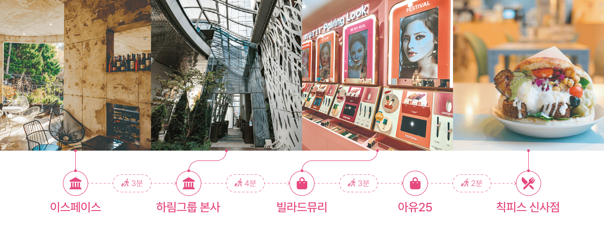 A course with a total length of 890m that allows you to explore the gorgeous buildings and beauty shops near Garosu-gil. There are many spots that are good for leaving authentication shots, so it is recommended to leave camera space empty in advance.