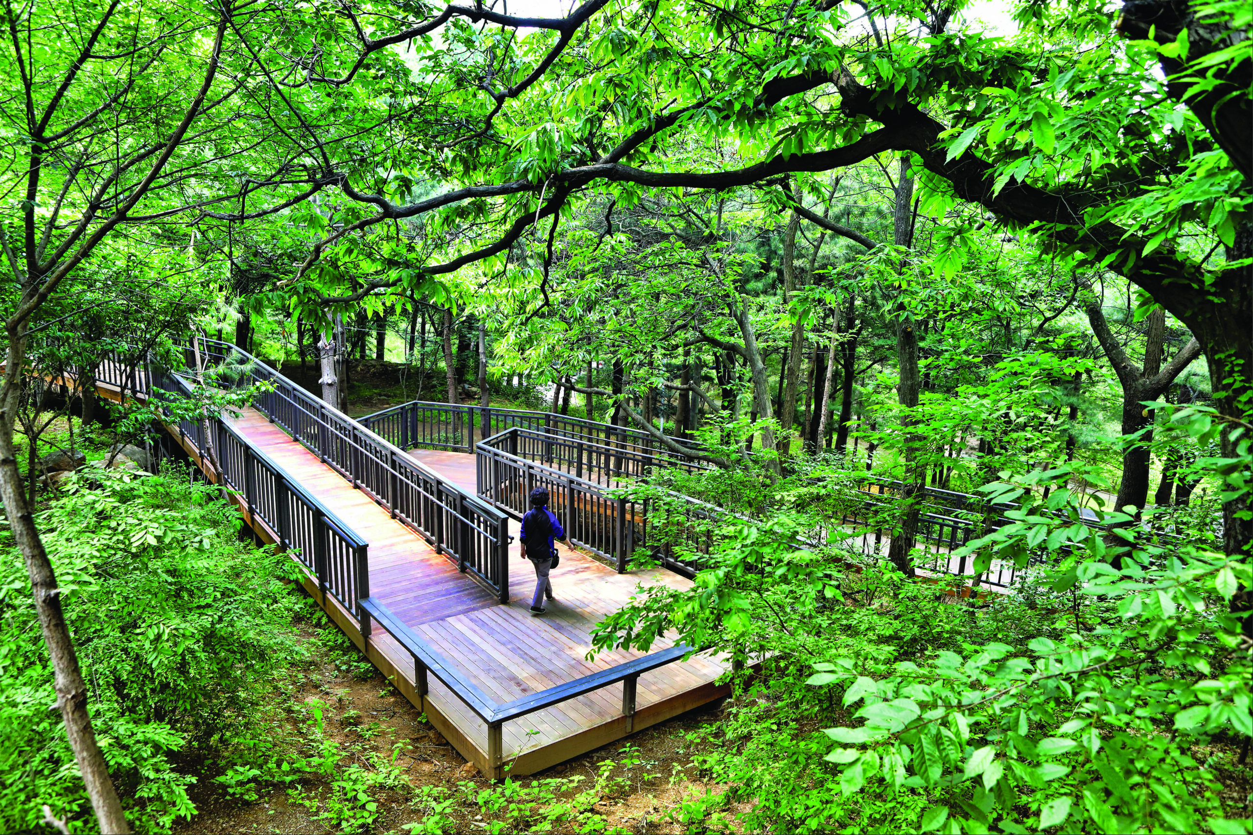 Standing 293 meters tall, Daemosan was originally called Halmi-san ('old woman mountain') for its shape. After King Taejong's tomb (Heonneung) was enshrined nearby, a royal decree renamed it Daemosan. The mountain offers both a ridge trail following the mountain spine and a circumference trail that remains close to nature. A stone cairn built up over 20 years and an observation deck are notable landmarks. The summit is approximately 3 km away — once you pass the steep stairs, the remainder is relatively gentle ups and downs. In 2021, 'Jarak-gil,' a trail with reduced incline, was created to allow safe forest access for people with disabilities, the elderly, and expectant mothers who would otherwise find hiking difficult.