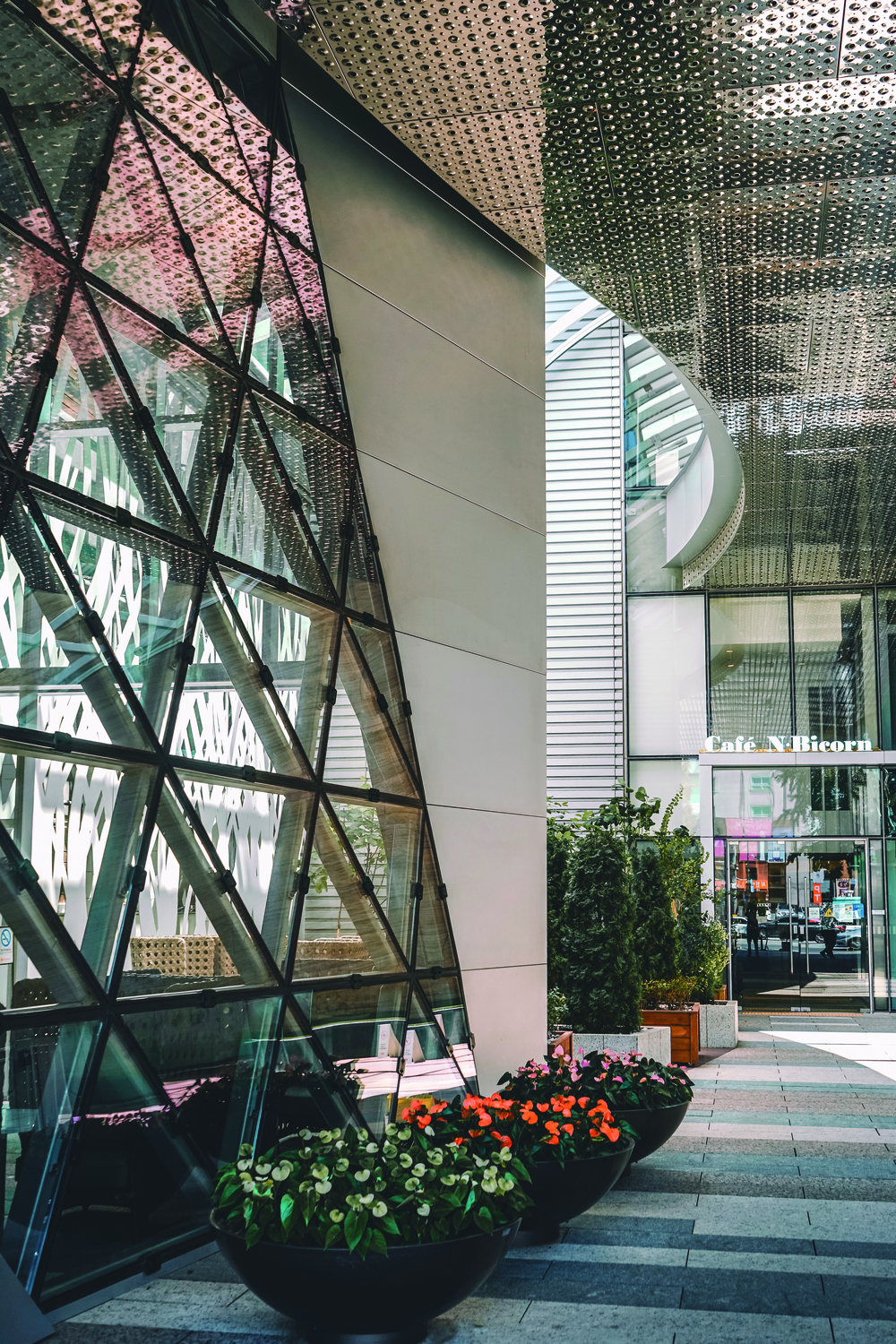 When you think of chicken, Harim is the first company that comes to mind. The office building is located across Garosu-gil in Sinsa-dong. Harim Group's headquarters, completed in August 2016, won the Korea Architectural Culture Award for Excellence in 2017 and the 9th Gangnam-gu Beautiful Building Award (non-residential) in 2019. Several commercial facilities, including a cafe, are located on the first floor of the 14-story building. When viewed from a distance, the flowing curves across the front of the building are impressive. It is especially noticeable at night because light-emitting diodes (LEDs) are installed along the curve, making the front of the building shine brilliantly in golden color.