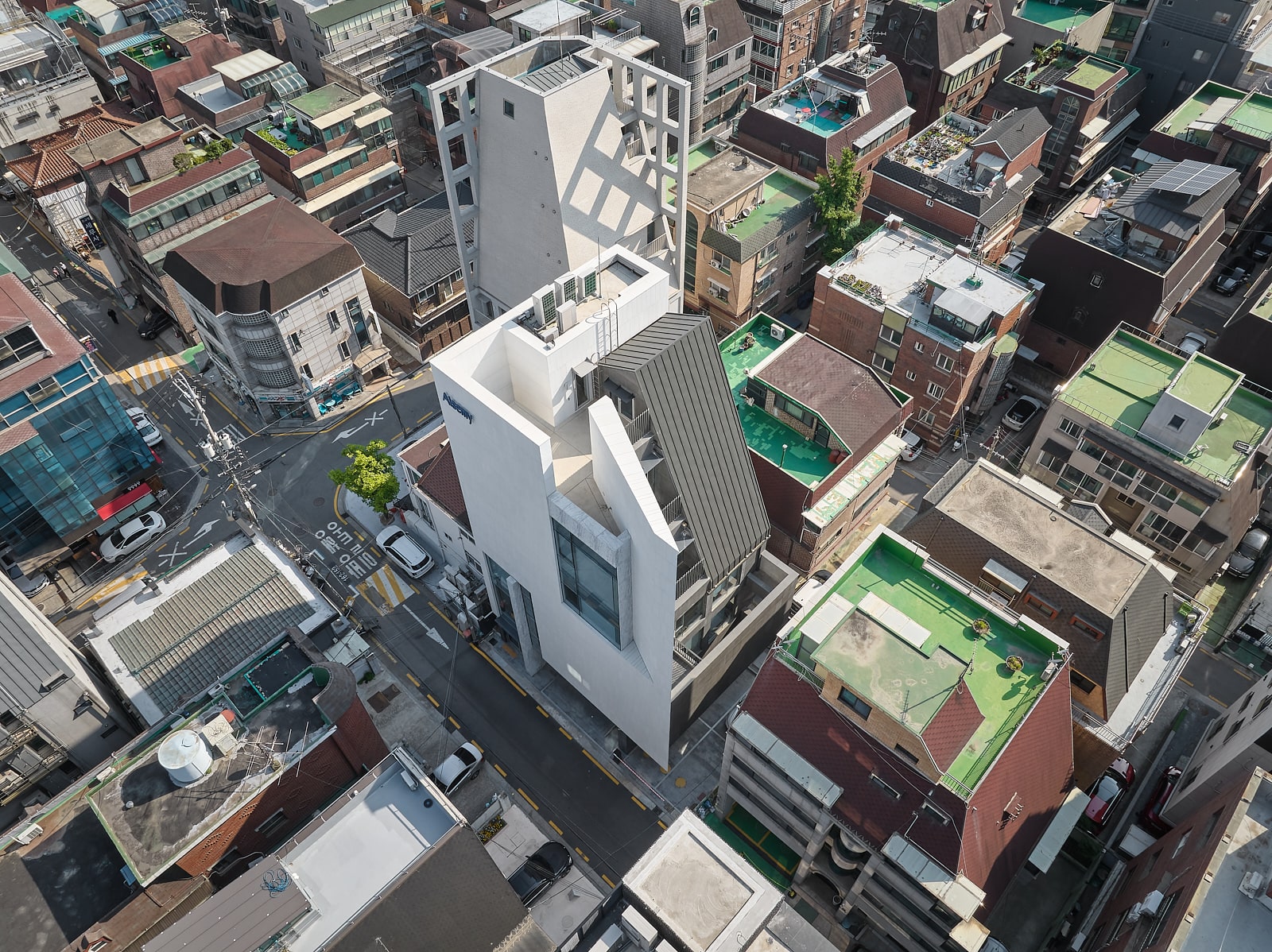 White Cliff, the headquarters of an IT company, was conceived as a dream workplace where play and work coexist—a place where creative potential and teamwork among employees are paramount. The limitation of a small urban building, where programs must be stacked vertically, was turned into an advantage: a 'Category Mixing Zone' lounge on the first floor engages with the street and allows different domains to intersect. As an office in a residential area, the motif of a massive white cliff expresses both privacy protection and the character of the space.